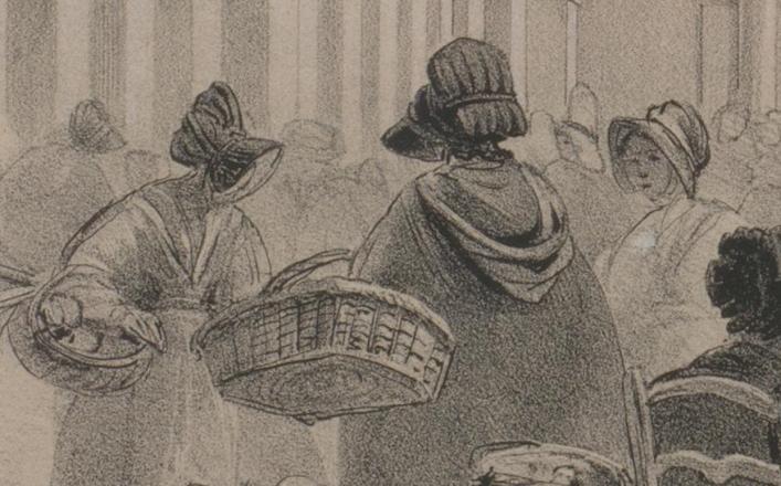 From Anne Sophia Harvey's account books Domestic Expenditure, [from] 1 January 1829 (brown leather), and Anne Sophia Harvey's Household Expenditure, 1 July 1838, which ends in December 1842, part of Library's extensive Harvey Collection. Anne Sophia Grut (1802-1844) was daughter of Peter Grut and Anne Collings, and married John Harvey. The illustration is a detail from a 'Moss' print of 1841, Market Place, Guernsey, in the Library Collection.