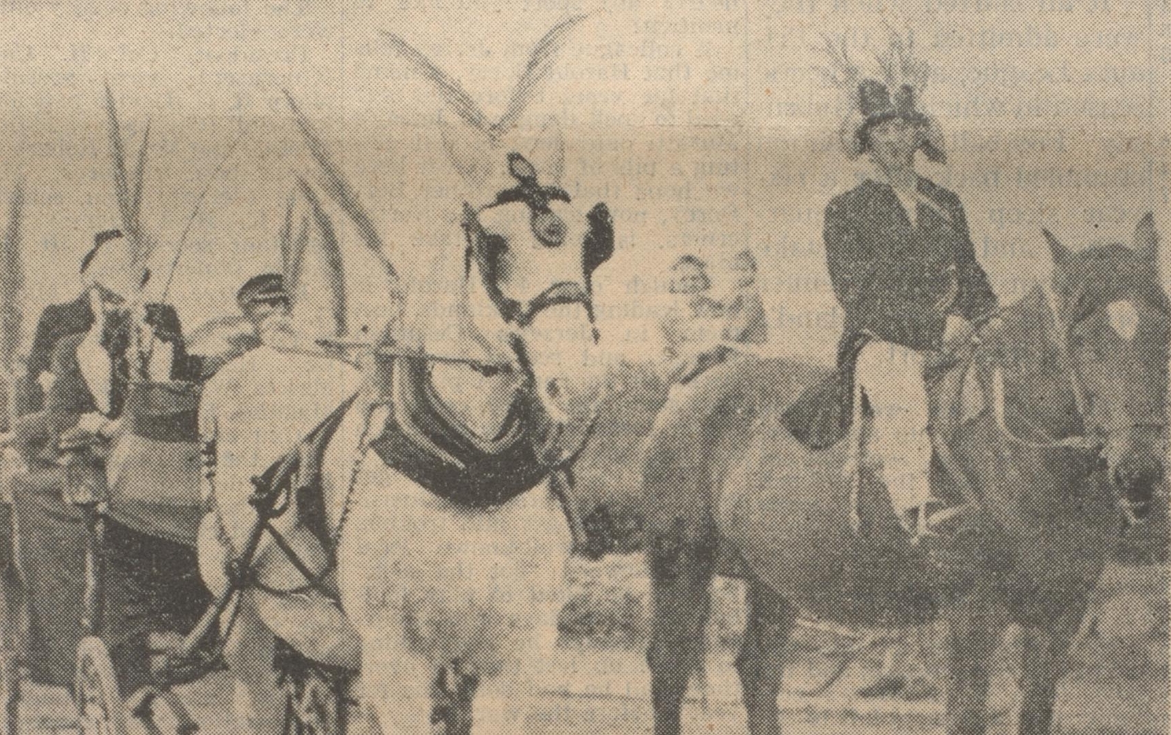 They started just after 1.30 pm, from their HQ at St Saviour’s British Legion Hall, and rode through the Castel to the North, along the Front to Town and home again. There was Osmond Sarre, who led the procession on horseback, dressed in an old black suit with plumes of pampas grass waving in his hat. Frank Roberts drove the decorated wagonette in which the guy, a dignified personage in a bowler hat, rode. The ‘herald,’ Bill Brehaut, in a costume like a red and white draught board and a black face, rode with the guy. (Click photographs to enlarge.)