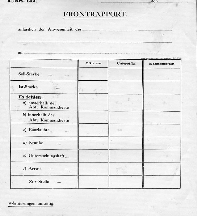 Register, German military, in German. [Name of unit] [date] [location]. Divided into three columns: Officers, sub-officers, private soldiers. Expected numbers. Actual numbers. Enumerate missing a) excepted commanders b) included commanders c) on leave d) Sick e) In custody f) in military detention g) At their post. Further comments overleaf.